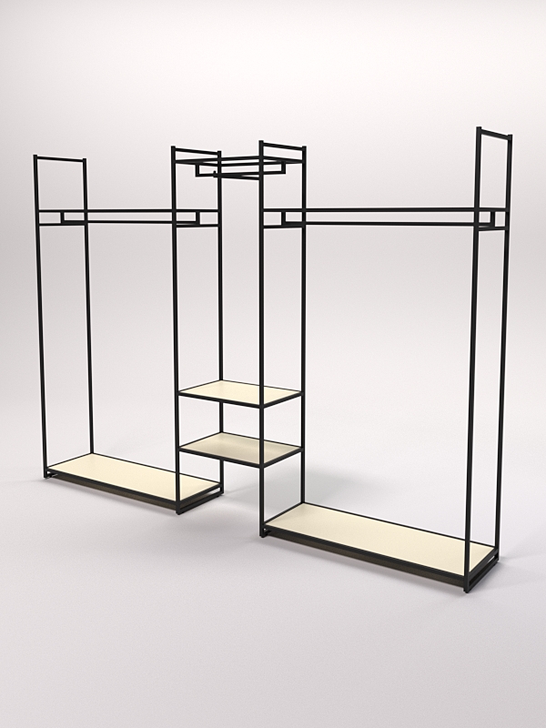 Комбинированный стеллаж для одежды необходим для удобного и наглядного размещения товаров в магазине или бутике. Кронштейн позволяет разместить вешалки с одеждой, а полки обеспечивают хранение аксессуаров и других товаров. Стильный дизайн в стиле лофт привлекает внимание покупателей и придает торговой площади особую атмосферу.