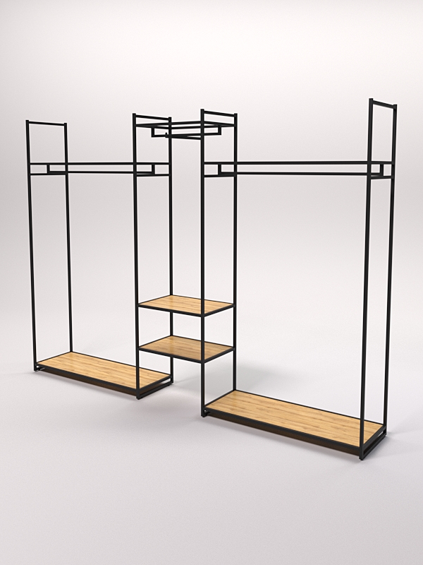 Комбинированный стеллаж для одежды необходим для удобного и наглядного размещения товаров в магазине или бутике. Кронштейн позволяет разместить вешалки с одеждой, а полки обеспечивают хранение аксессуаров и других товаров. Стильный дизайн в стиле лофт привлекает внимание покупателей и придает торговой площади особую атмосферу.