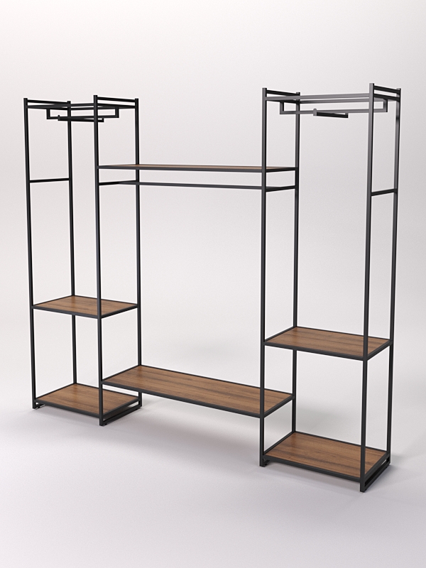 Комбинированный стеллаж для одежды необходим для удобного и наглядного размещения демонстрации и каталога магазина. Стильный дизайн в стиле лофт привлекает внимание покупателей и придает торговой площади особую атмосферу.