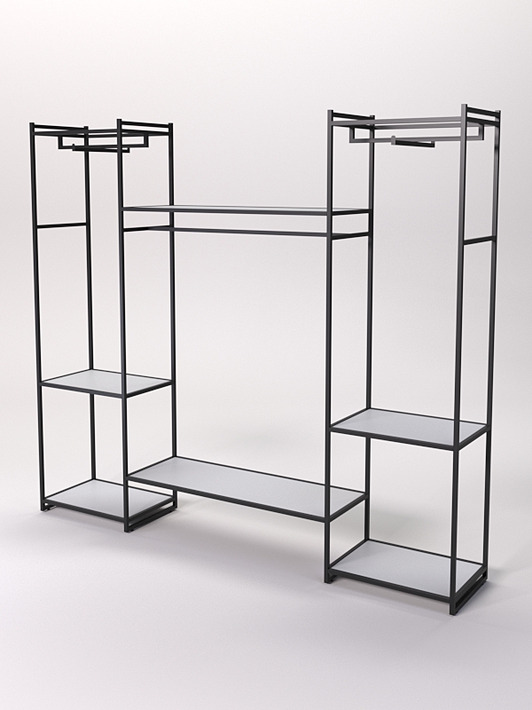 Изделие оснащено кронштейном, которое позволяет разместить вешалки с лучшей демонстрации одежды. На полках из ЛДСП можно разместить сложенную рубашки, а также аксессуары. Данная модель позволяет разместить большое количество разнообразных элементов гардероба. Можно использовать в самых разных магазинах одежды, бутиках, шоурумах и даже на выездных мероприятиях.