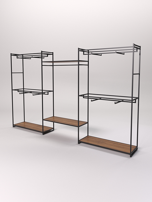 Комбинированный стеллаж для одежды необходим для удобного и наглядного размещения товаров в магазине или бутике. Модель широкая.