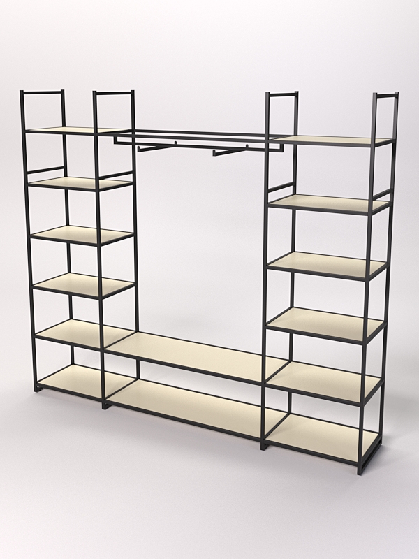 Кронштейны для вешалок позволят удобно разместить вашу одежду на виду у покупателей. Четырнадцать полок позволят разместить не только одежду, но и различные аксессуары, например, обувь или головные уборы.