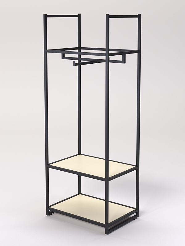 Модель оснащена кронштейном для вешалок. На вешалках можно размещать любую одежду, которую удобно хранить в подвешенном состоянии. Например, платья, блузки, рубашки, куртки, пальто, брюки, юбки и т.д. В нижней части имеется две полка из ЛДСП. Полки стеллажа в магазине одежды нужны для размещения различных товаров, таких как одежда, обувь, аксессуары и т. д. Они помогают организовать пространство и обеспечивают удобный доступ к товарам для покупателей.