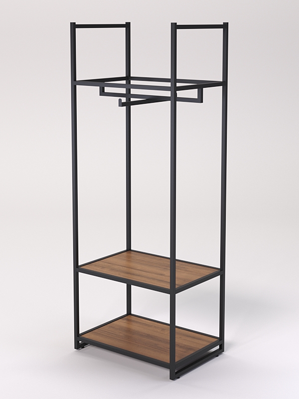 Модель оснащена кронштейном для вешалок. На вешалках можно размещать любую одежду, которую удобно хранить в подвешенном состоянии. Например, платья, блузки, рубашки, куртки, пальто, брюки, юбки и т.д. В нижней части имеется две полка из ЛДСП. Полки стеллажа в магазине одежды нужны для размещения различных товаров, таких как одежда, обувь, аксессуары и т. д. Они помогают организовать пространство и обеспечивают удобный доступ к товарам для покупателей.
