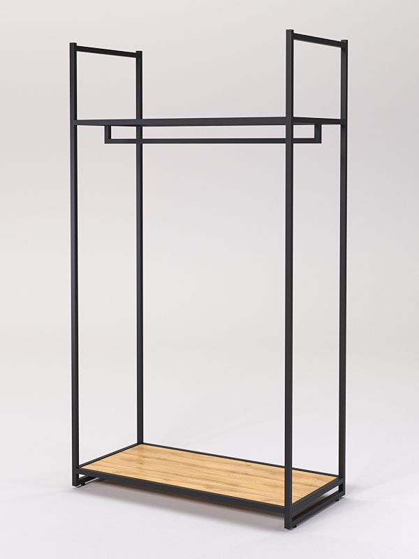 Стеллаж для одежды. Стеллаж обеспечивает надежное хранение одежды, а также привлекает внимание покупателей своим оригинальным дизайном. Штанга для вешалок позволяет удобно разместить товар, а полка из ЛДСП предоставляет дополнительное пространство для хранения аксессуаров и обуви.