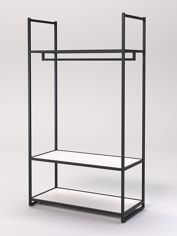 Стеллаж для одежды. Стеллаж обеспечивает надежное хранение одежды, а также привлекает внимание покупателей своим оригинальным дизайном. Штанга с кронштейном для вешалок позволяет удобно разместить товар, а две полки из ЛДСП предоставляет дополнительное пространство для хранения аксессуаров и обуви.
