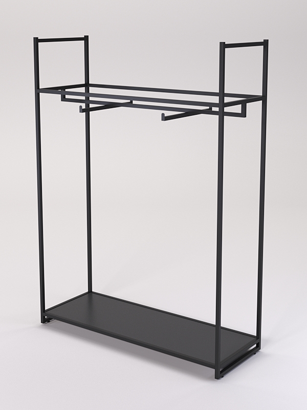 Стеллаж для одежды. Стеллаж обеспечивает надежное хранение одежды, а также привлекает внимание покупателей своим оригинальным дизайном. Оснащен штанга для вешалок с двумя кронштейнами, которая позволяет удобно разместить одежду, а полка из ЛДСП предоставляет дополнительное пространство для хранения аксессуаров и обуви.