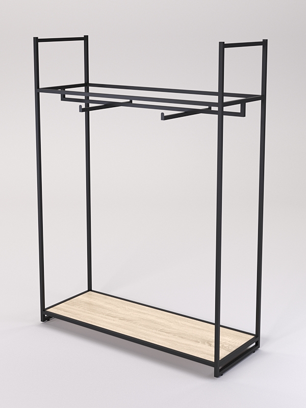 Стеллаж для одежды. Стеллаж обеспечивает надежное хранение одежды, а также привлекает внимание покупателей своим оригинальным дизайном. Оснащен штанга для вешалок с двумя кронштейнами, которая позволяет удобно разместить одежду, а полка из ЛДСП предоставляет дополнительное пространство для хранения аксессуаров и обуви.