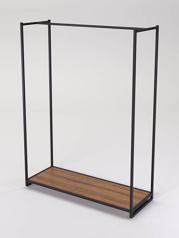 Стеллаж для одежды. Модель широкая. Стеллаж предназначен для демонстрации, а также обеспечивает надежное хранение одежды и привлекает внимание покупателей своим оригинальным дизайном. Оснащен штангой для вешалок, которая позволяет удобно разместить одежду, а полка из ЛДСП предоставляет дополнительное пространство для хранения аксессуаров и обуви.