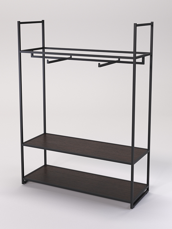 Штанга для вешалок с кронштейном позволяет демонстрировать одежду с максимальной видимостью и доступностью. Внизу имеется две полки из ЛДСП, которые обеспечивает дополнительное место для хранения аксессуаров, шапок, обуви и мелких предметов.