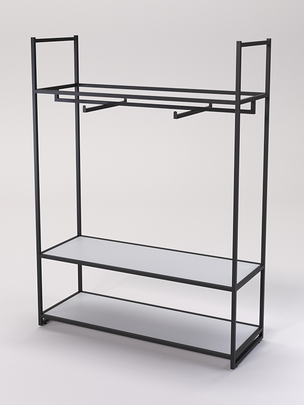 Штанга для вешалок с кронштейном позволяет демонстрировать одежду с максимальной видимостью и доступностью. Внизу имеется две полки из ЛДСП, которые обеспечивает дополнительное место для хранения аксессуаров, шапок, обуви и мелких предметов.