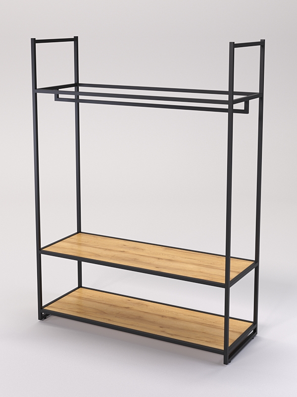 Конструкция оснащена штангой. Такая штанга предназначена, чтобы повесить на нее вешалки. Это позволяет демонстрировать одежду с максимальной видимостью и доступностью. Внизу имеются две полки из ЛДСП, которые обеспечивает дополнительное место для хранения аксессуаров, шапок, обуви и мелких предметов.