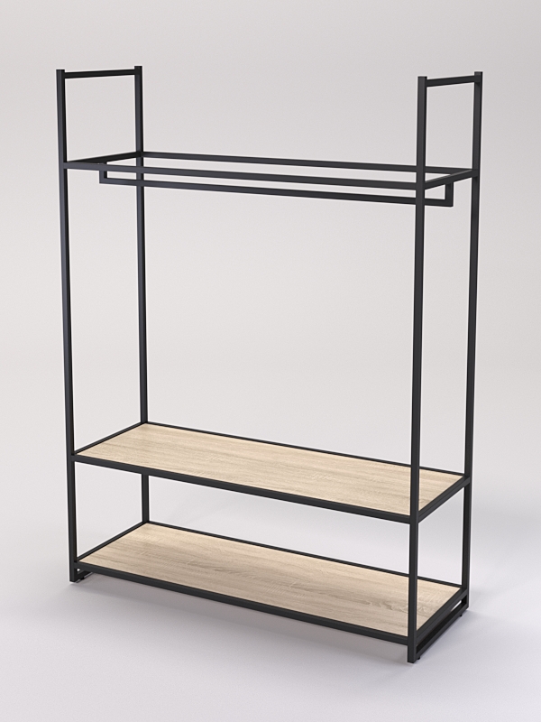 Конструкция оснащена штангой. Такая штанга предназначена, чтобы повесить на нее вешалки. Это позволяет демонстрировать одежду с максимальной видимостью и доступностью. Внизу имеются две полки из ЛДСП, которые обеспечивает дополнительное место для хранения аксессуаров, шапок, обуви и мелких предметов.