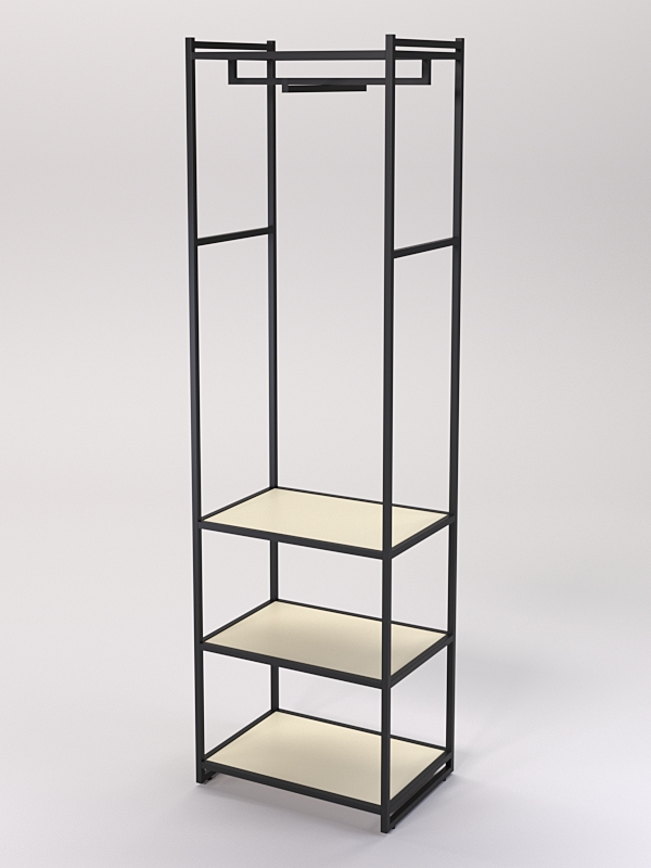 Модель оснащена кронштейном для вешалок. На вешалках можно размещать любую одежду, которую удобно хранить в подвешенном состоянии. Например, платья, блузки, рубашки, куртки, пальто, брюки, юбки и т.д. В нижней части имеется три полка из ЛДСП. Полки стеллажа в магазине одежды нужны для размещения различных товаров, таких как одежда, обувь, аксессуары и т. д. Они помогают организовать пространство и обеспечивают удобный доступ к товарам для покупателей.