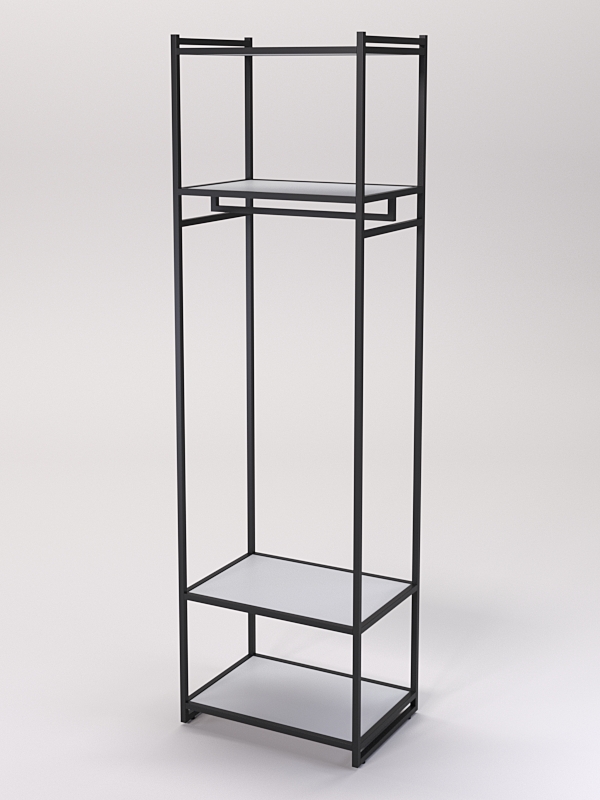 Модель оснащена штангой с кронштейном, который предназначен для вешалок. На вешалках можно размещать любую одежду, которую удобно демонстрировать в подвешенном состоянии. Например, платья, блузки, рубашки, куртки, пальто, брюки, юбки и т.д. Верхняя часть оснащена двумя полками. Нижняя часть оснащена двумя полками. Такие полки нужны в магазине одежды нужны для размещения различных товаров, таких как одежда, обувь, аксессуары и т. д. Они помогают организовать пространство и обеспечивают удобный доступ к товарам для покупателей.