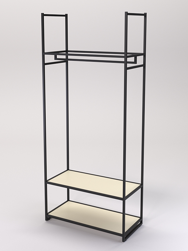 Модель оснащена в верхней части кронштейном для вешалок. На вешалке можно размещать любую одежду, которую удобно демонстрировать в подвешенном состоянии. Например, платья, блузки, рубашки, куртки, пальто, брюки, юбки и т.д. В нижней части имеются две полки. Полки стеллажа в магазине одежды нужны для размещения различных товаров, таких как одежда, обувь, аксессуары и т. д. Они помогают организовать пространство и обеспечивают удобный доступ к товарам для покупателей.