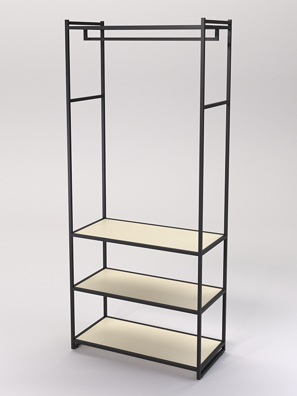 Модель оснащена в верхней части кронштейном для вешалок. На вешалке можно размещать любую одежду, которую удобно демонстрировать в подвешенном состоянии. Например, платья, блузки, рубашки, куртки, пальто, брюки, юбки и т.д. В нижней части имеются три полки. Полки стеллажа в магазине одежды нужны для размещения различных товаров, таких как одежда, обувь, аксессуары и т. д. Они помогают организовать пространство и обеспечивают удобный доступ к товарам для покупателей.