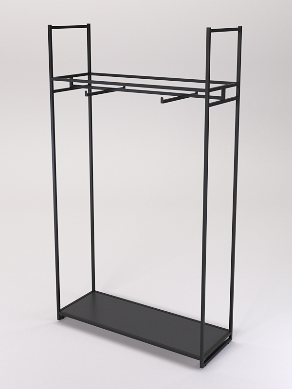 Модель оснащена штангой с двумя кронштейнами для вешалок. На вешалках можно размещать любую одежду, которую удобно демонстрировать в подвешенном состоянии. Например, платья, блузки, рубашки, куртки, пальто, брюки, юбки и т.д.