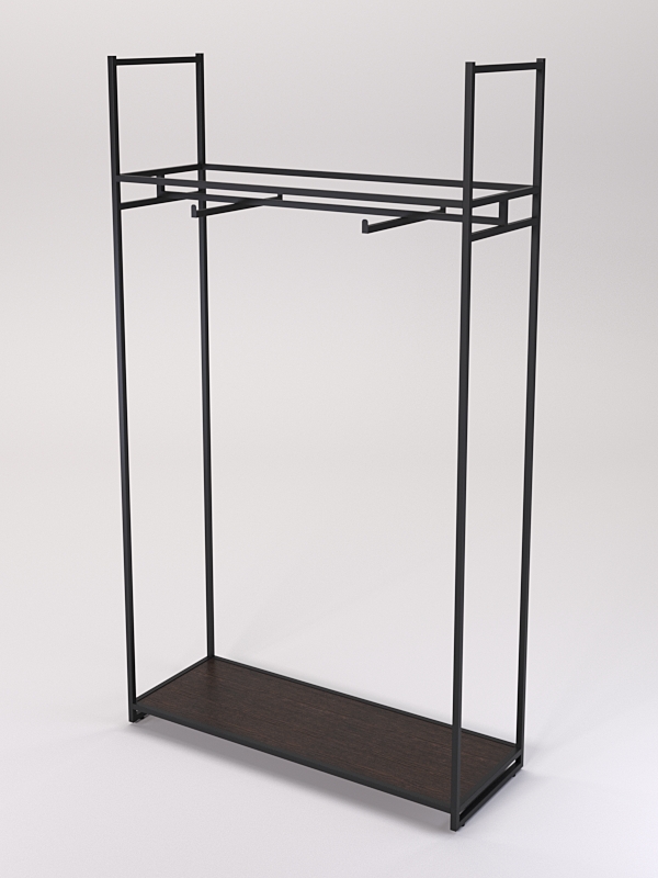 Модель оснащена штангой с двумя кронштейнами для вешалок. На вешалках можно размещать любую одежду, которую удобно демонстрировать в подвешенном состоянии. Например, платья, блузки, рубашки, куртки, пальто, брюки, юбки и т.д.