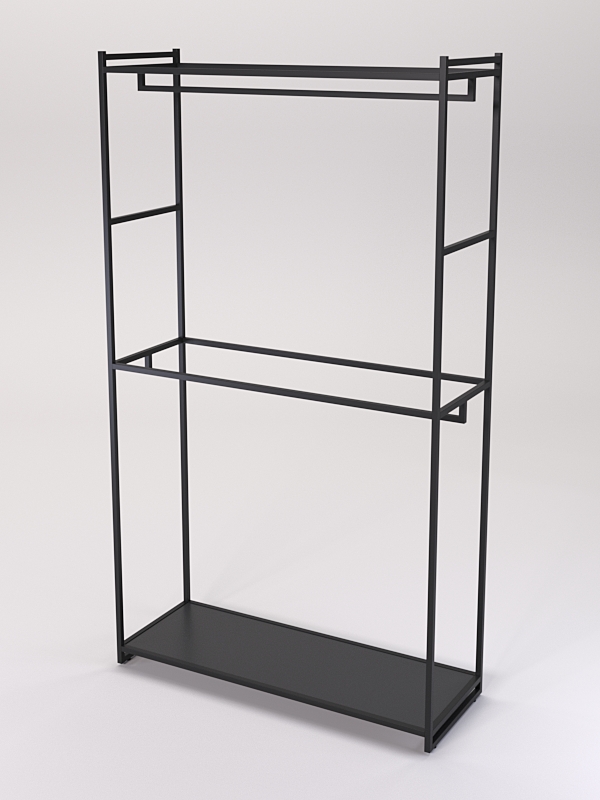 Модель оснащена в верхней части и средней части штангами с кронштейном для вешалок. На вешалках можно размещать любую одежду, которую удобно демонстрировать в подвешенном состоянии. Например, платья, блузки, рубашки, куртки, пальто, брюки, юбки и т.д.
