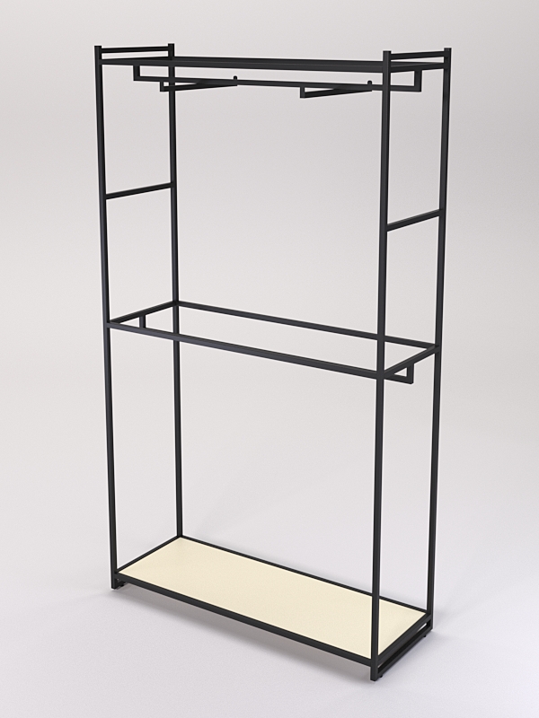Модель оснащена в верхней части и средней части штангами с кронштейном для вешалок. На вешалках можно размещать любую одежду, которую удобно демонстрировать в подвешенном состоянии. Например, платья, блузки, рубашки, куртки, пальто, брюки, юбки и т.д.