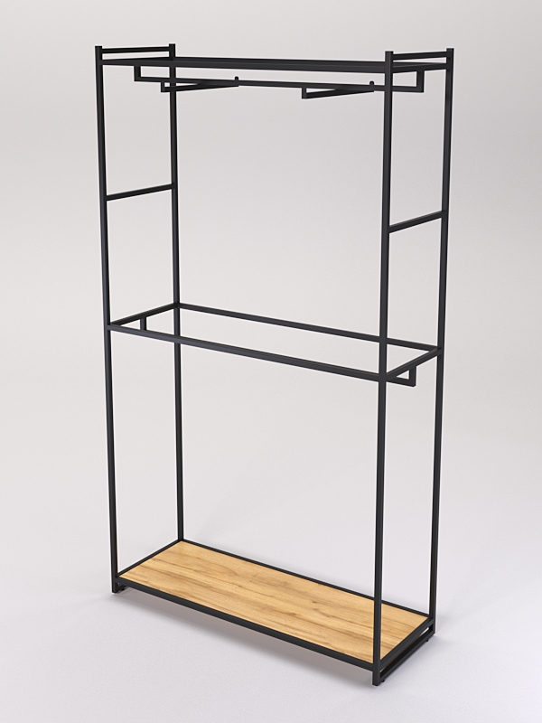 Модель оснащена в верхней части и средней части штангами с кронштейном для вешалок. На вешалках можно размещать любую одежду, которую удобно демонстрировать в подвешенном состоянии. Например, платья, блузки, рубашки, куртки, пальто, брюки, юбки и т.д.
