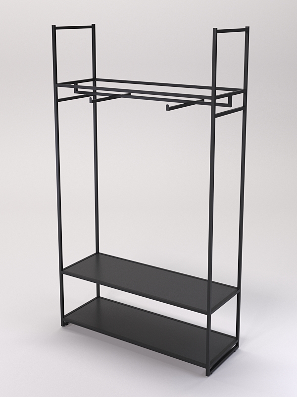 В нижней части имеются две полки. На полках стеллажей в магазине одежды можно разместить различные элементы одежды, такие как платья, юбки, брюки блузки, рубашки и свитеры, а также головные уборы, перчатки, шарфы, обувь и аксессуары.