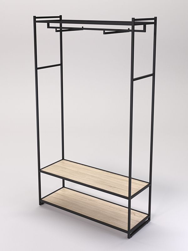 В нижней части имеются две полки. На полках стеллажей в магазине одежды можно разместить различные элементы одежды, такие как платья, юбки, брюки блузки, рубашки и свитеры, а также головные уборы, перчатки, шарфы, обувь и аксессуары.
