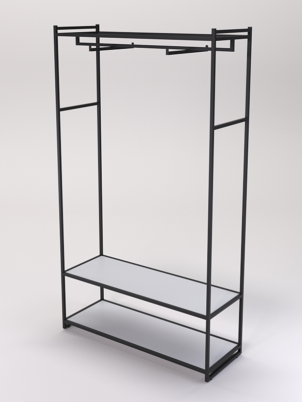 В нижней части имеются две полки. На полках стеллажей в магазине одежды можно разместить различные элементы одежды, такие как платья, юбки, брюки блузки, рубашки и свитеры, а также головные уборы, перчатки, шарфы, обувь и аксессуары.