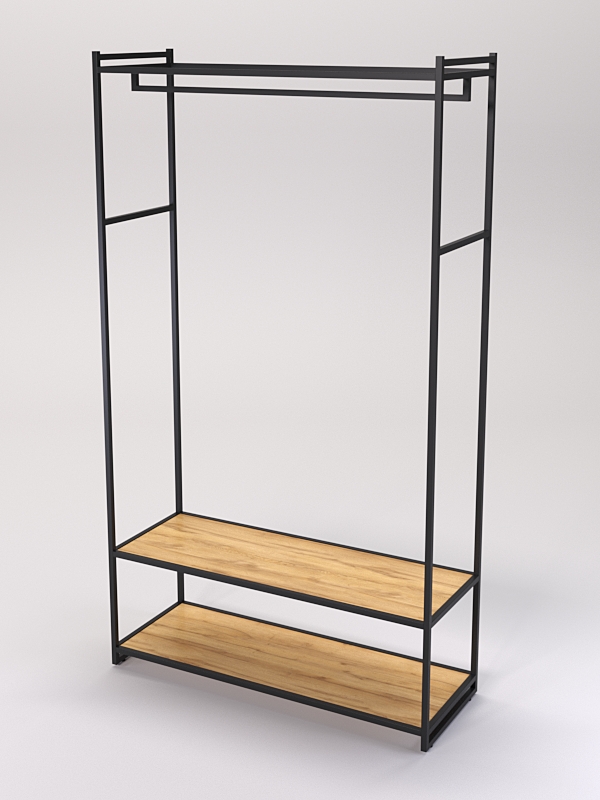 В нижней части имеются две полки. На полках стеллажей в магазине одежды можно разместить различные элементы одежды, такие как платья, юбки, брюки блузки, рубашки и свитеры, а также головные уборы, перчатки, шарфы, обувь и аксессуары.