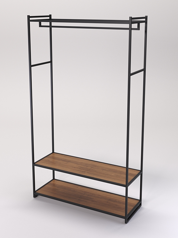 В нижней части имеются две полки. На полках стеллажей в магазине одежды можно разместить различные элементы одежды, такие как платья, юбки, брюки блузки, рубашки и свитеры, а также головные уборы, перчатки, шарфы, обувь и аксессуары.