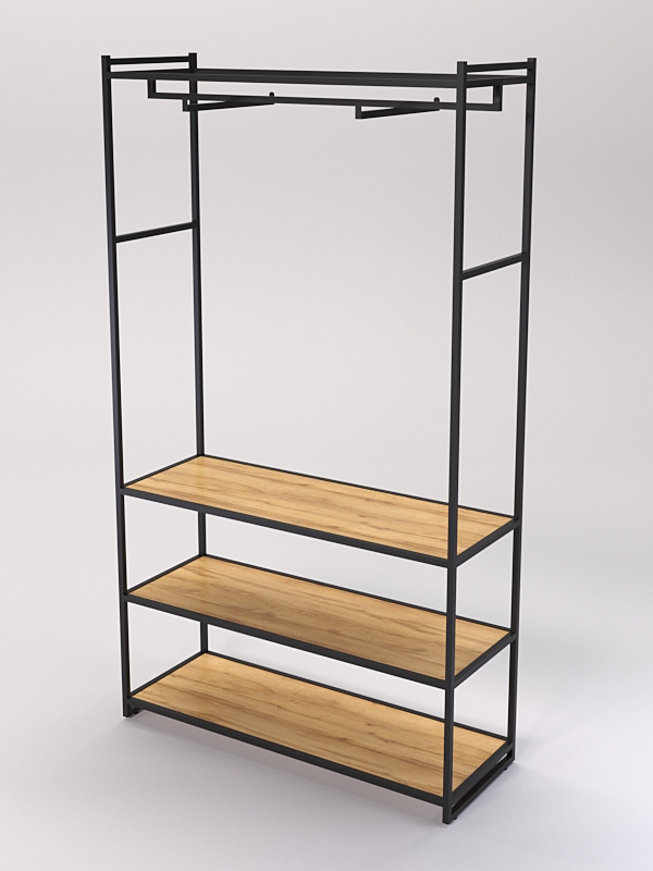 В нижней части имеются три полки. На полках стеллажей в магазине одежды можно разместить различные элементы одежды, такие как платья, юбки, брюки блузки, рубашки и свитеры, а также головные уборы, перчатки, шарфы, обувь и аксессуары.