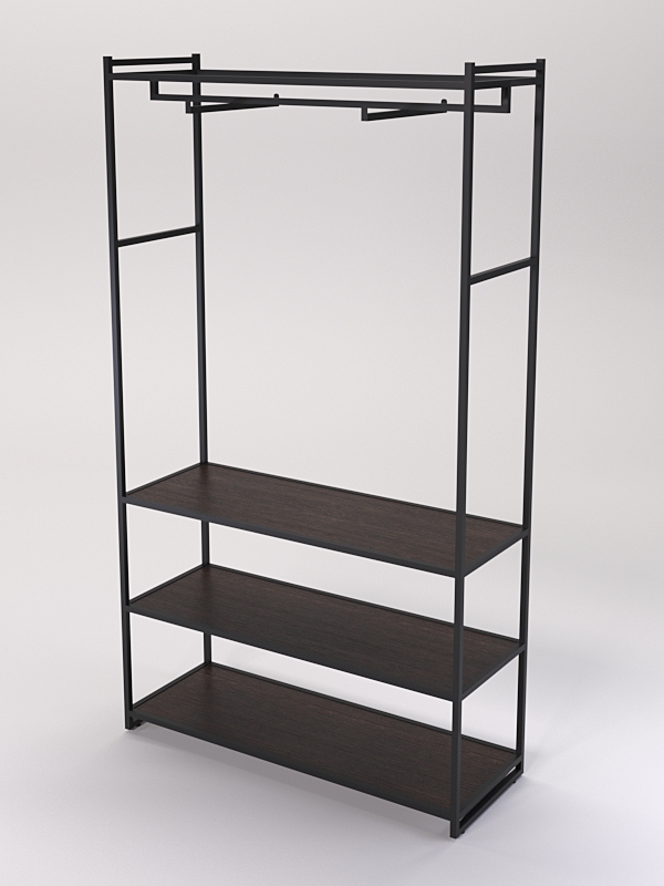 В нижней части имеются три полки. На полках стеллажей в магазине одежды можно разместить различные элементы одежды, такие как платья, юбки, брюки блузки, рубашки и свитеры, а также головные уборы, перчатки, шарфы, обувь и аксессуары.