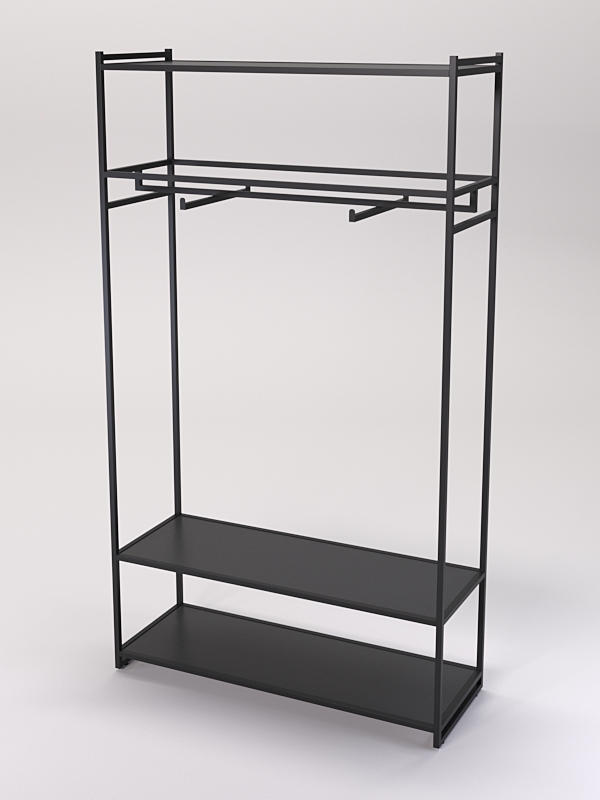 Изделие оснащено тремя полками. В нижней части две полки, а в верхней одна. На полках стеллажей в магазине одежды можно разместить различные элементы одежды, такие как платья, юбки, брюки блузки, рубашки и свитеры, а также головные уборы, перчатки, шарфы, обувь и аксессуары.
