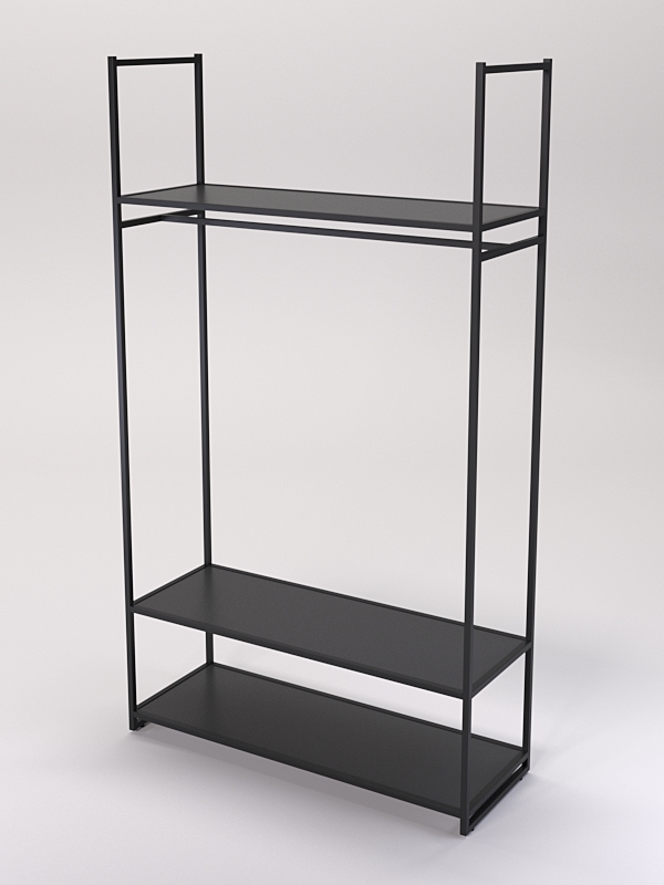 Изделие оснащено тремя полками. В нижней части две полки, а в верхней одна. На полках стеллажей в магазине одежды можно разместить различные элементы одежды, такие как платья, юбки, брюки блузки, рубашки и свитеры, а также головные уборы, перчатки, шарфы, обувь и аксессуары.