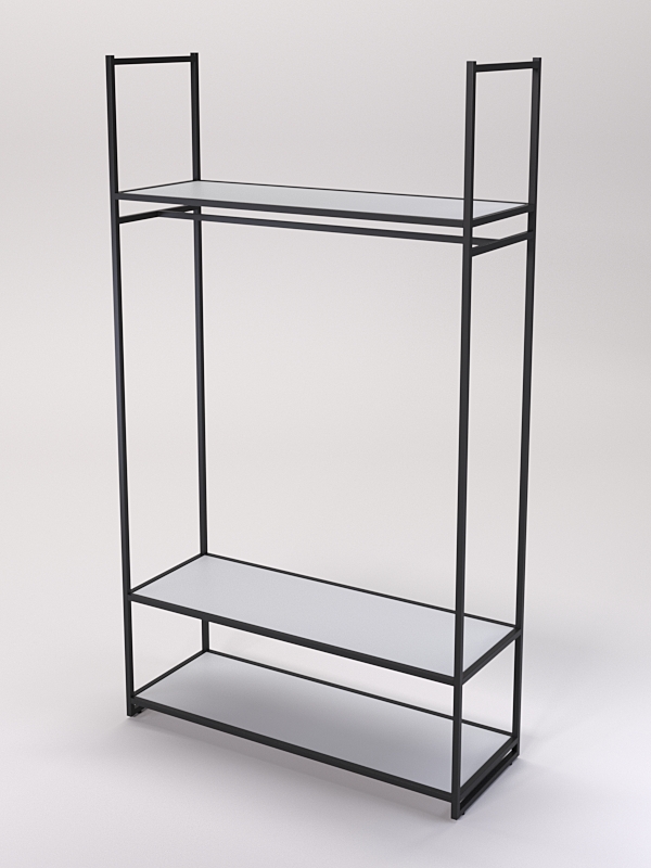 Изделие оснащено тремя полками. В нижней части две полки, а в верхней одна. На полках стеллажей в магазине одежды можно разместить различные элементы одежды, такие как платья, юбки, брюки блузки, рубашки и свитеры, а также головные уборы, перчатки, шарфы, обувь и аксессуары.