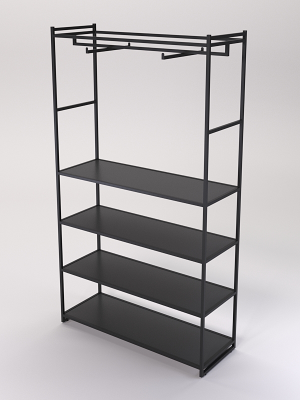 Изделие оснащено четырьмя полками. На полках стеллажей в магазине одежды можно разместить различные элементы одежды, такие как платья, юбки, брюки блузки, рубашки и свитеры, а также головные уборы, перчатки, шарфы, обувь и аксессуары.