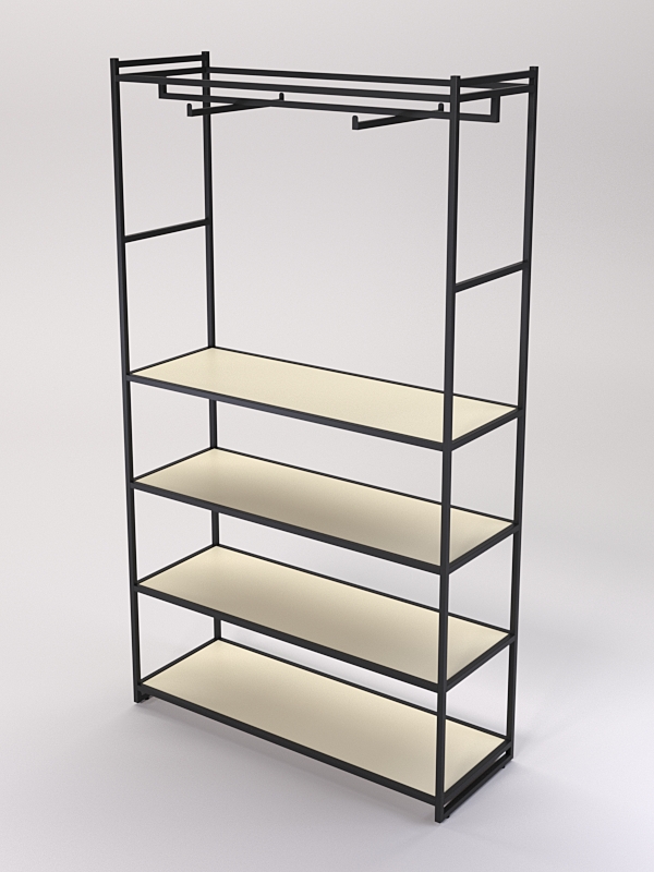 Изделие оснащено четырьмя полками. На полках стеллажей в магазине одежды можно разместить различные элементы одежды, такие как платья, юбки, брюки блузки, рубашки и свитеры, а также головные уборы, перчатки, шарфы, обувь и аксессуары.