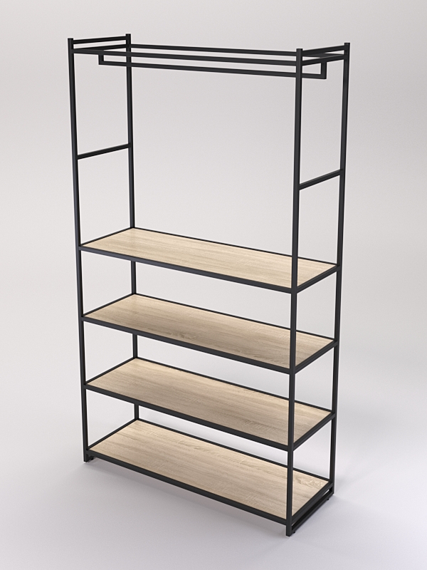 Изделие оснащено четырьмя полками. На полках стеллажей в магазине одежды можно разместить различные элементы одежды, такие как платья, юбки, брюки блузки, рубашки и свитеры, а также головные уборы, перчатки, шарфы, обувь и аксессуары.