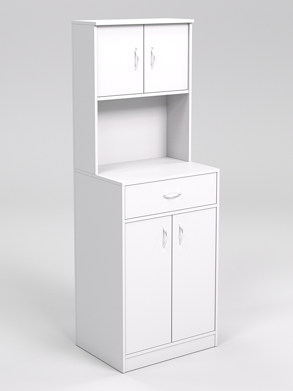 Станция двойная. Каркас из ДСП. Фурнитура — металл, хром. Конструкция состоит из двух выдвижных ящиков и шкафчика с дверцами.