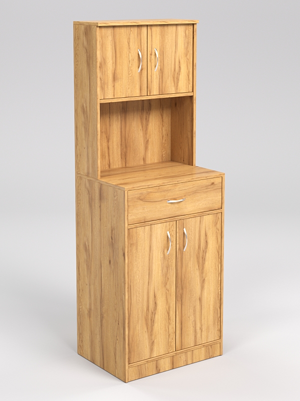 Станция двойная. Каркас из ДСП. Фурнитура — металл, хром. Конструкция состоит из двух выдвижных ящиков и шкафчика с дверцами.