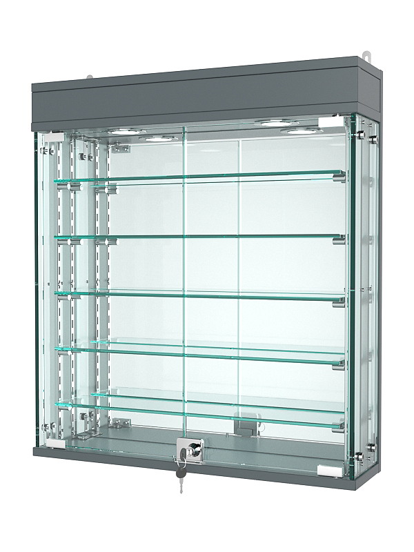 Данная модель включает пять стеклянных полок и распашные дверки, закрывающиеся на ключ. Отличительная деталь — зеркальная задняя панель, позволяющая рассмотреть товар со всех сторон. Верхняя подсветка делает витрину ярче, а ее содержимое — заметнее.