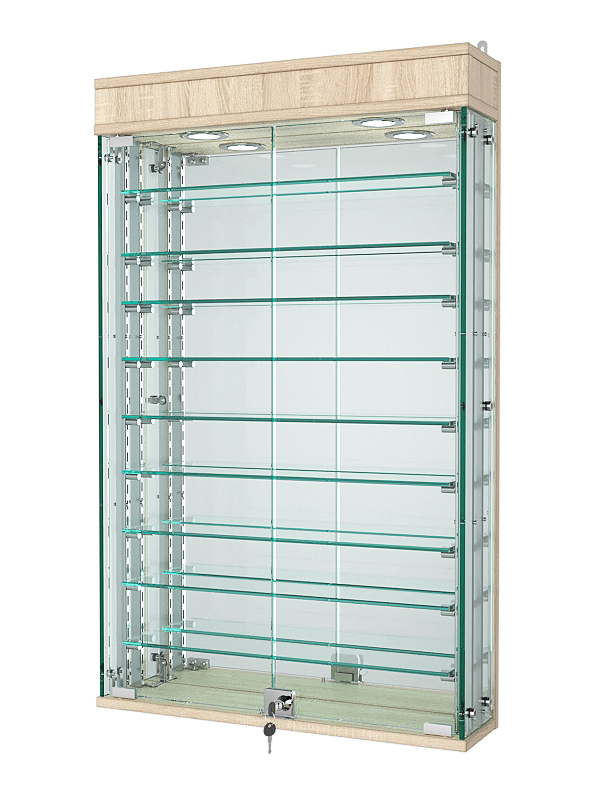 Данная модель включает девять стеклянных полок и распашные дверки, закрывающиеся на ключ. Отличительная деталь — зеркальная задняя панель, позволяющая рассмотреть товар со всех сторон. Верхняя подсветка делает витрину ярче, а ее содержимое — заметнее.
