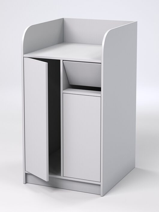 - Удобное хранение: Тумба оснащена двумя шкафчиками для хранения принадлежностей и аксессуаров, а также удобным отсеком для мусорного ведра. Подвижная дверца обеспечивает легкий доступ для утилизации, не открывая ящик полностью.