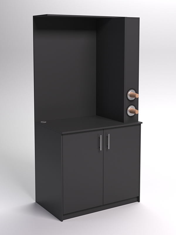 Конструкция предусматривает пространство, которое закрывается на двери, где можно хранить аксессуары и расходные материалы для кофемашины, такие как фильтры, чистящие средства, зерна кофе и т.д. Это обеспечивает порядок и удобство в использовании.