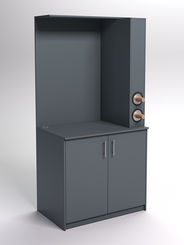 Конструкция предусматривает пространство, которое закрывается на двери, где можно хранить аксессуары и расходные материалы для кофемашины, такие как фильтры, чистящие средства, зерна кофе и т.д. Это обеспечивает порядок и удобство в использовании.