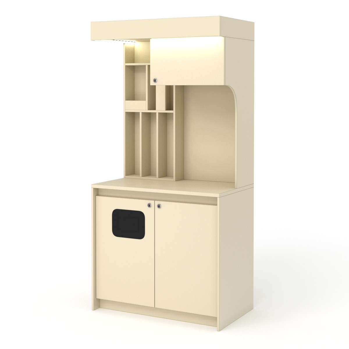 • Функциональные элементы: Кофепоинт оснащён большим закрытым ящиком, отсеком для мусорного ведра с подвижной дверцей, широкой столешницей, небольшими полочками для сиропов и вспомогательных аксессуаров, а также навесным шкафчиком с подсветкой. Все закрытые шкафчики имеют замки для безопасности содержимого.