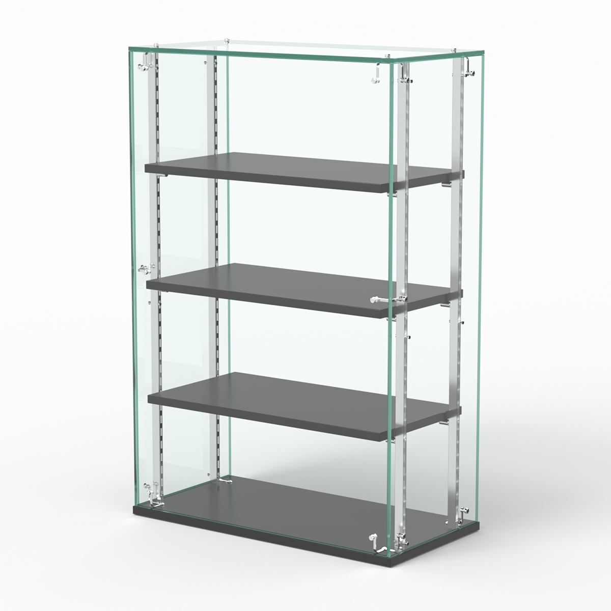Витрина полностью стеклянная. Внутри располагаются три прямые полки. Доступ к содержимому обеспечивается со стороны продавца.