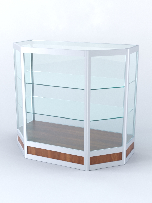 Прилавок имеет форму пятигранника. Конструкция открыта со стороны продавца. Высота подиума от пола — 15 см. Прилавок комплектуется двумя стеклянными полками, которые можно регулировать по высоте. Все размеры, а также комплектация могут быть изменены по желанию заказчика. Возможно добавление полок. Расцветка подбирается в вариантах стандарт и на заказ.