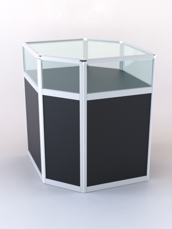 Прилавок из профиля угловой шестигранный №2 (открытый) изготавливается из алюминиевого профиля с использованием заполнителей из МДФ и стекла. Верхняя часть прилавка — прозрачная. Все размеры, а также комплектация, могут быть изменены по желанию заказчика. Возможно добавление полок. Цвет подбирается в вариантах стандарт и на заказ.